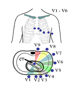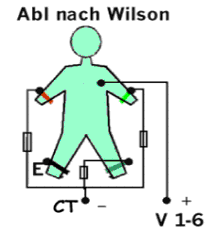 in der Mitte des Körpers, die als CT (central terminal) bezeichnet wird. Die Brustwand- ableitungen V1-V6 untersuchen das Potenzial zwischen dem CT und den