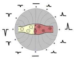 Es entstehen zwei entgegengesetzte Pole (=Dipol), von denen ein elektrisches Feld ausgeht, das in der Umgebung mit Elektroden registriert