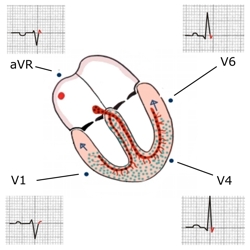 Nachdem die Zellen der Herzspitze depolarisiert sind, wandert die Erregung von der Herzspitze zur Basis des rechten und linken Ventrikels nach oben.