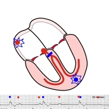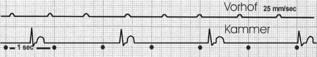 Beim AV-Block 3. Grades wird keine Erregung des Vorhofes mehr übergeleitet, die Kammer muss alleine zurecht kommen.