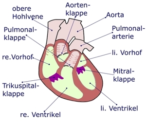 den linken Vorhof. Durch die Mitralklappe gelangt es in die linke Herzkammer, um dann durch die Aortenklappe in die