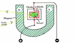die Drehung einer Drahtschleife im Magnetfeld, ein an der Spule angebrachtes Spiegelchen