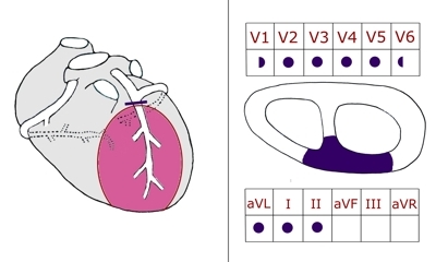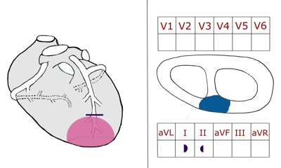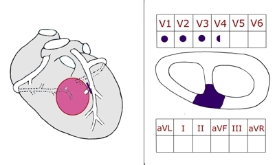 Die Vorder- und Seitenwand des linken Ventrikels und der vordere Abschnitt des Ventrikelseptums sind betroffen.