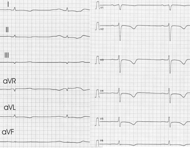 Im 12-Kanal-EKG sieht man die P-Welle deutlich, das Monitorbild ähnelt V3, allerdings auf dem Kopf stehen. Auffällig sind die negativen T- Wellen.