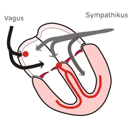 Die Nerven des Vagus haben Einfluss auf Sinusknoten, Vorhöfe und AV-Knoten, wirken bremsend und