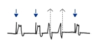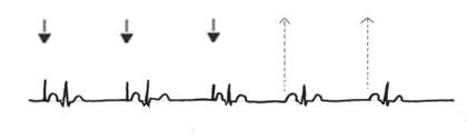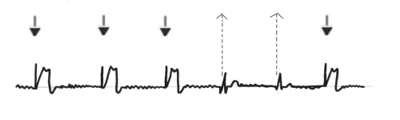die Ventrikelsonde stimmuliert, der Ventrikel schlägt dann zeitversetzt synchron(3+4+5.QRS) |